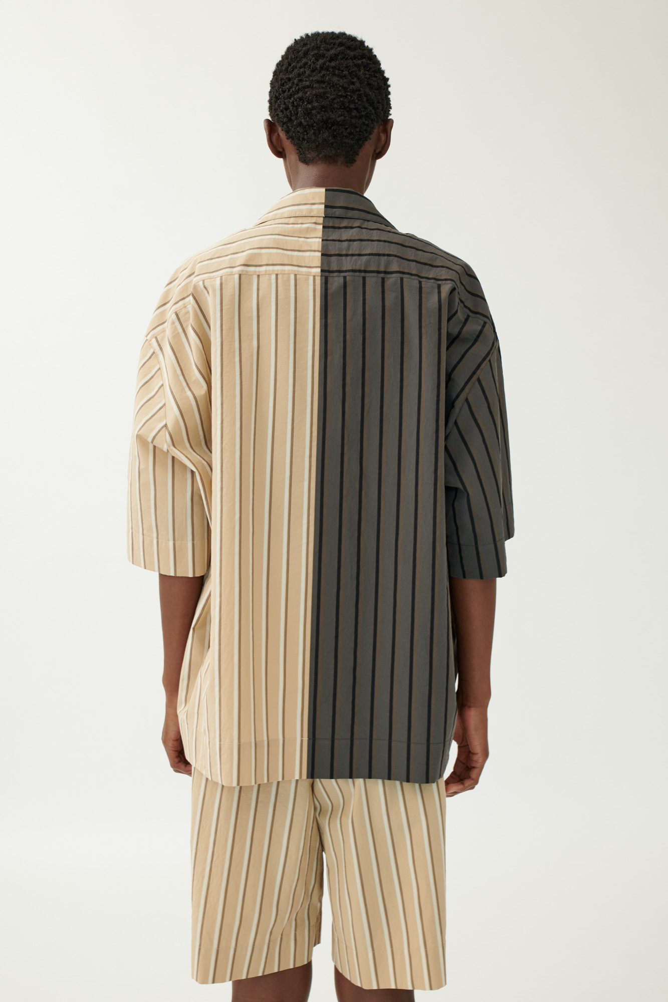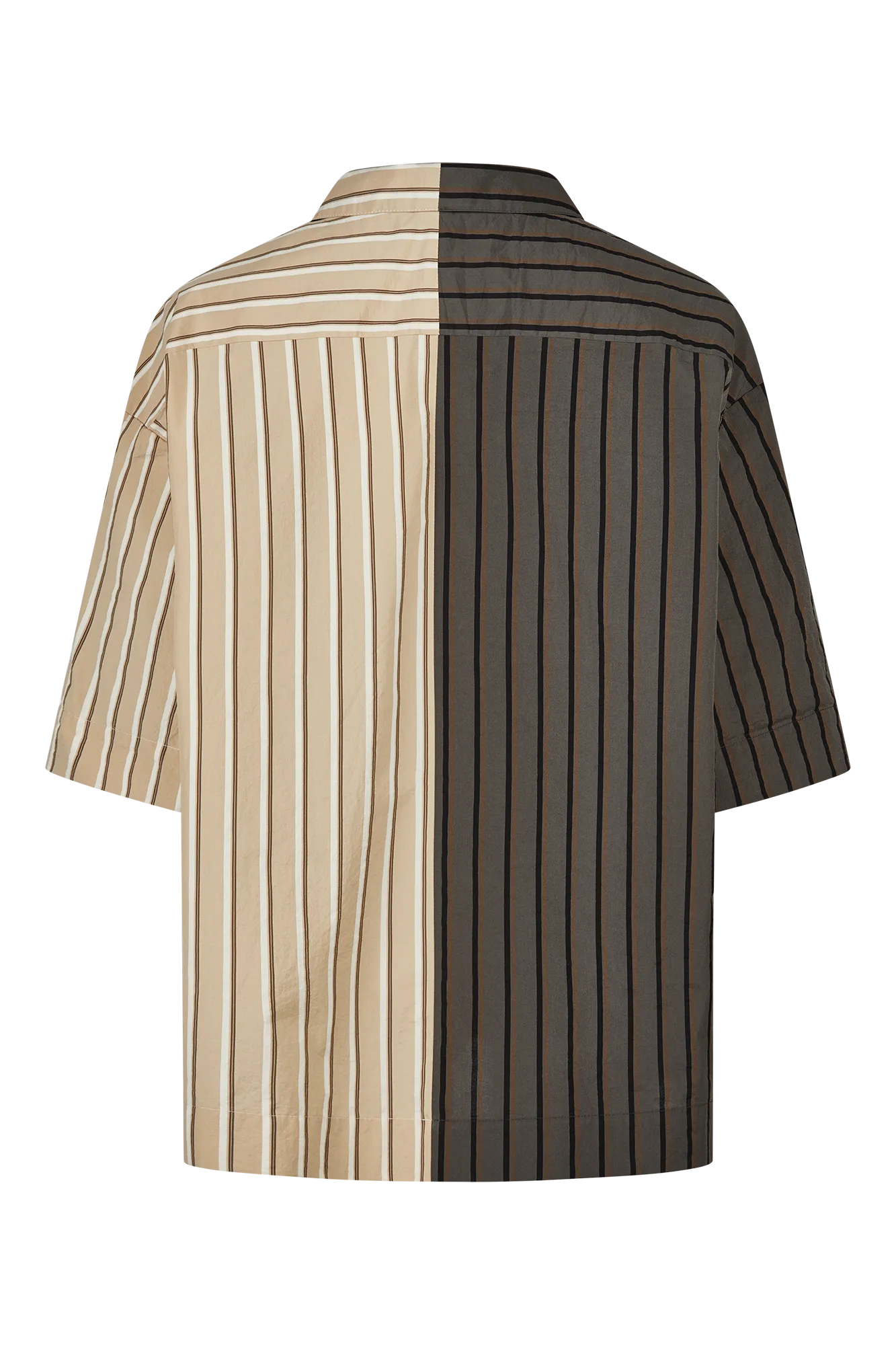 Эта блузка сочетает в себе графические элементы и деконструированный воротник. Вертикальные полосы, сдержанные цветовые блоки и короткие рукава делают ее универсальной вещью с современным дизайном. Плотный хлопковый поплин обеспечивает приятную текстуру и комфорт.
