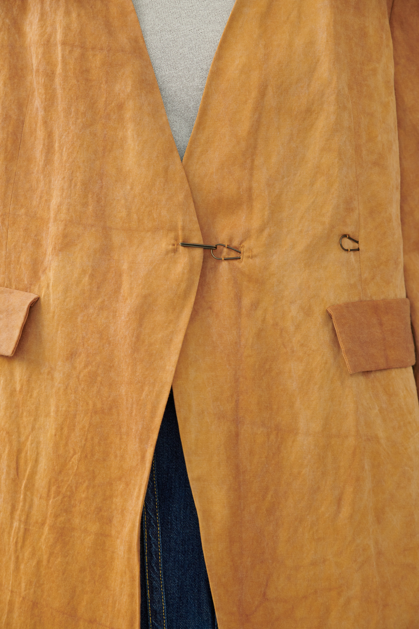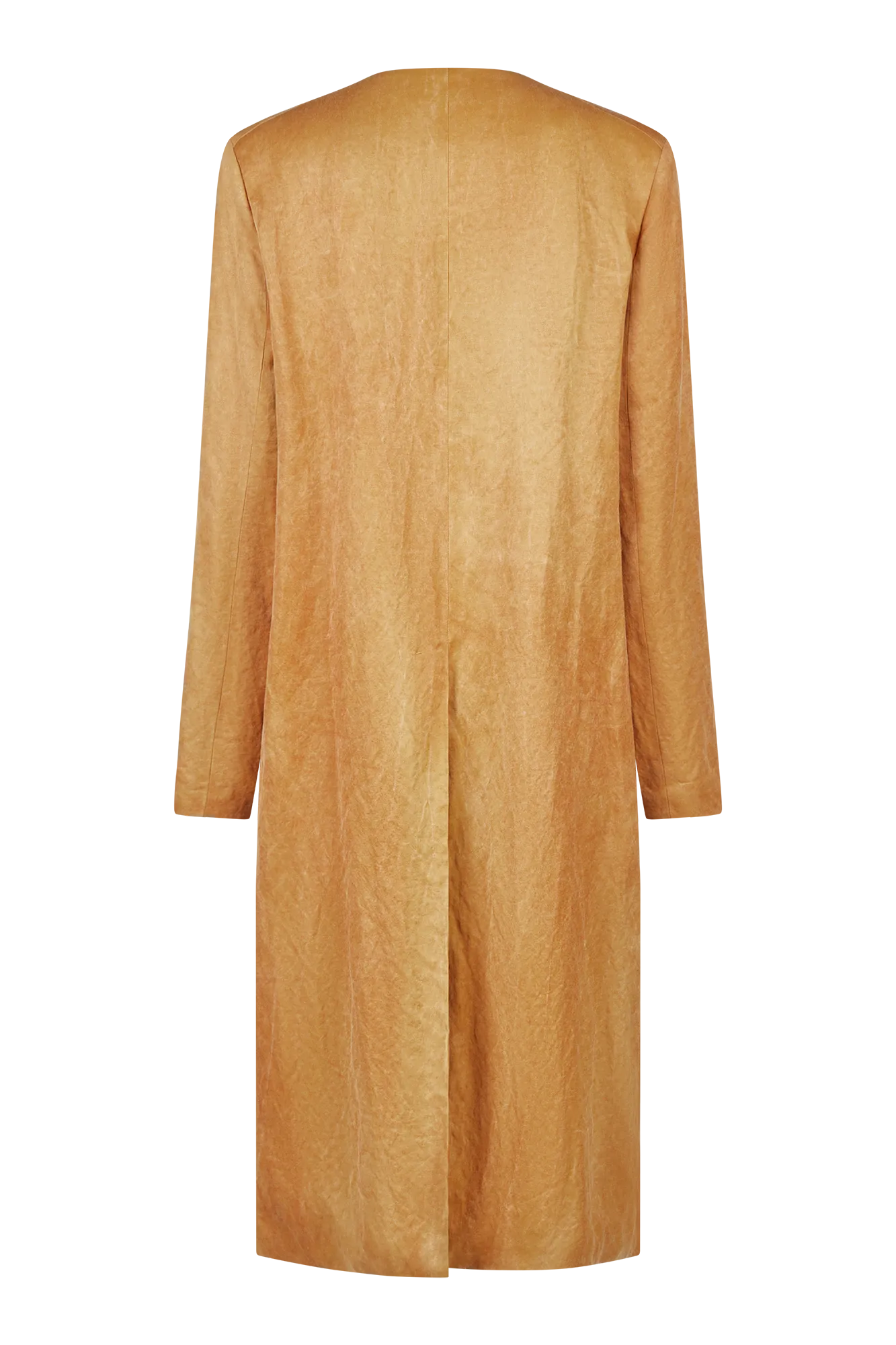Элегантное пальто без воротника с отделкой холодным крашением.