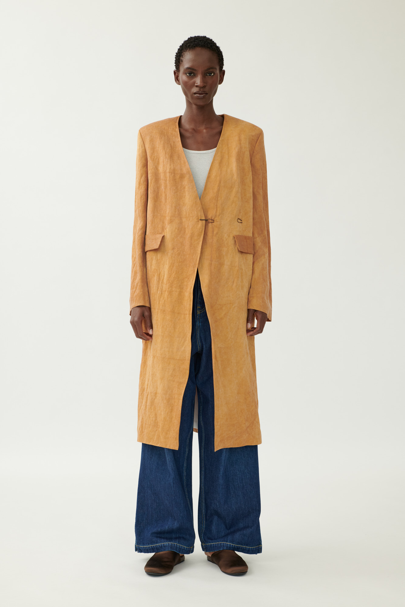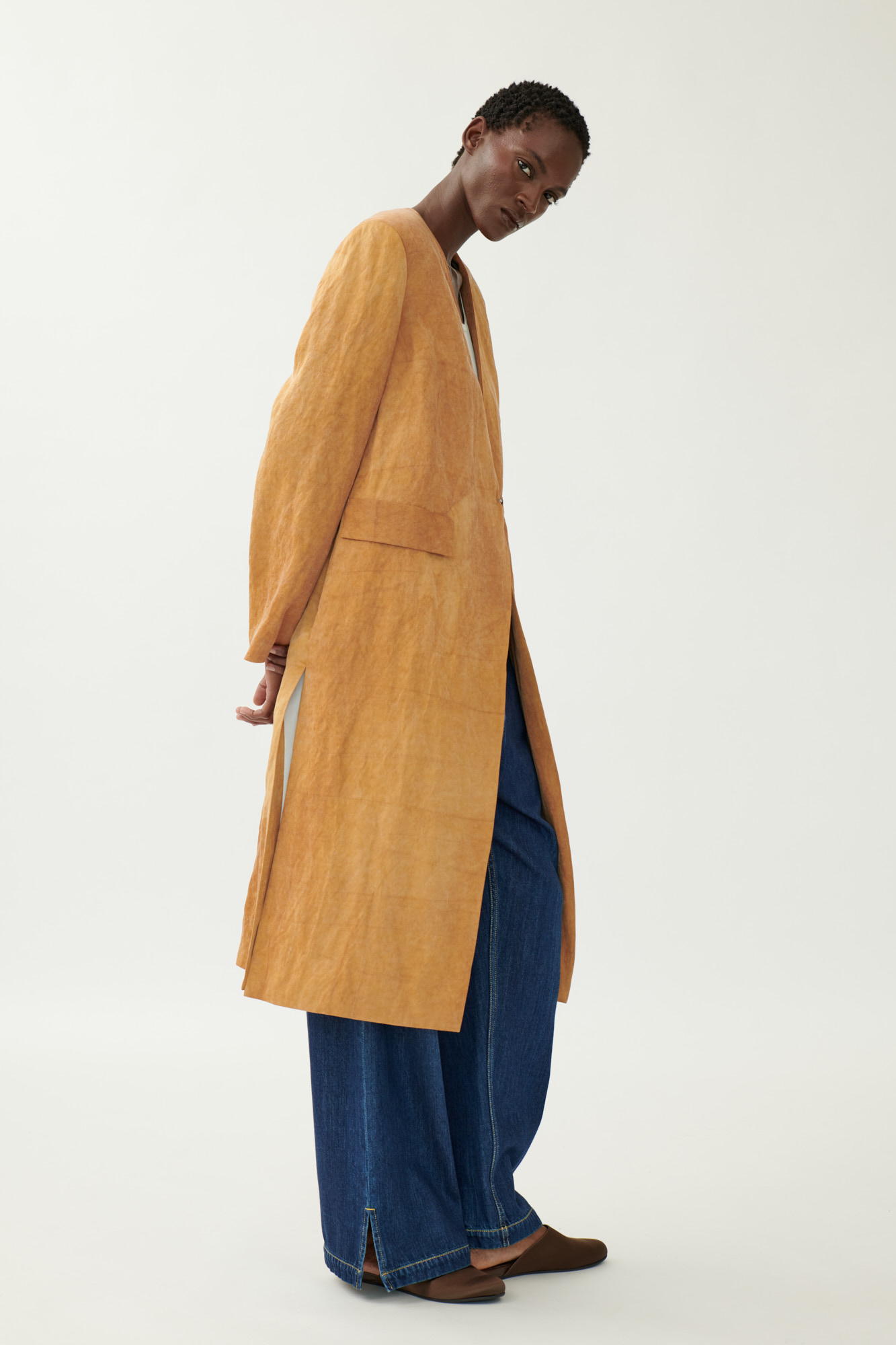 Это пальто прямого кроя впечатляет своим чистым, современным силуэтом и изысканными деталями. Дизайн без воротника и расклешенные рукава создают женственный образ, а особая отделка холодным крашением и слегка мерцающая вискозная ткань добавляют глубины и текстуры.