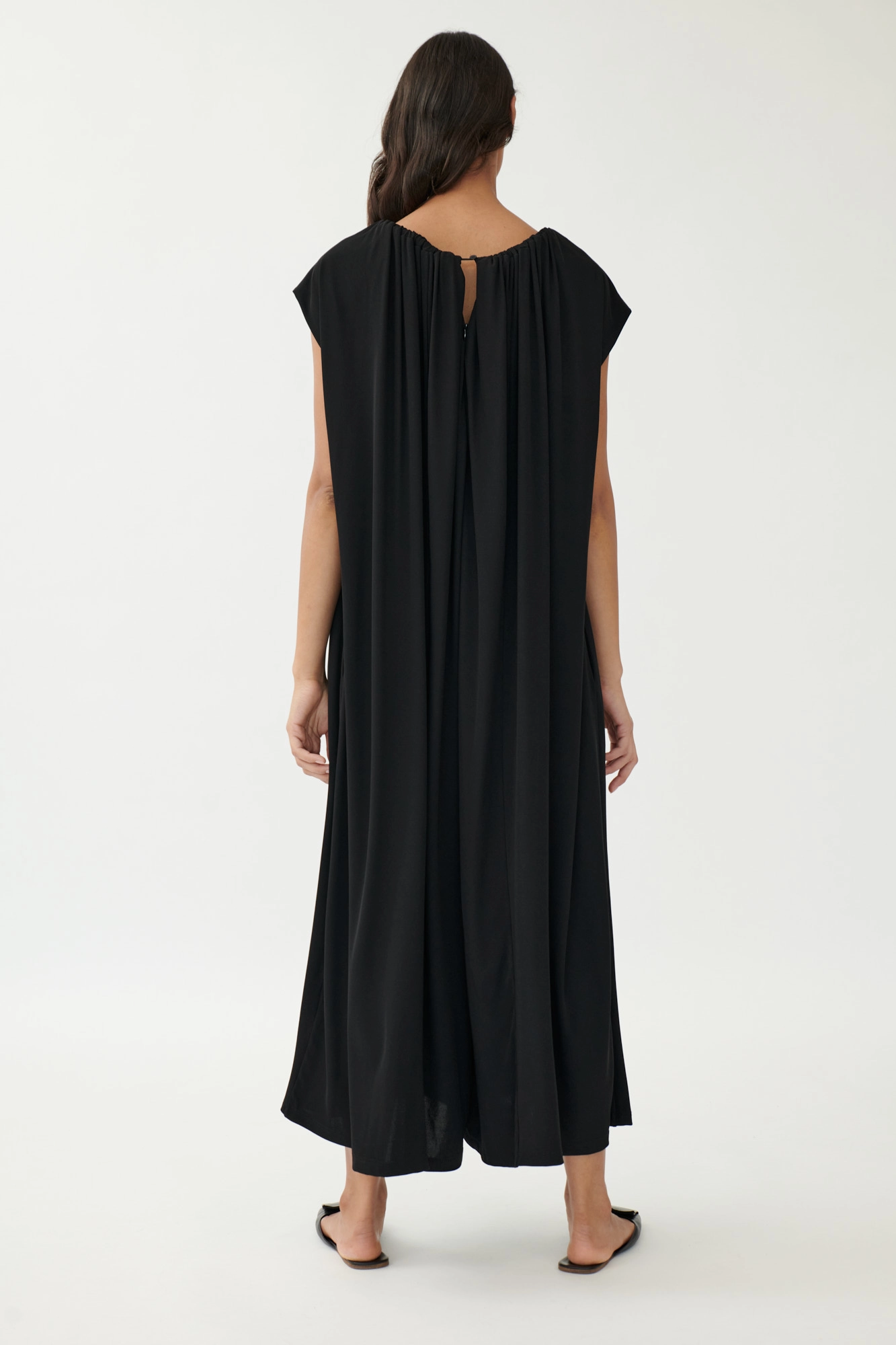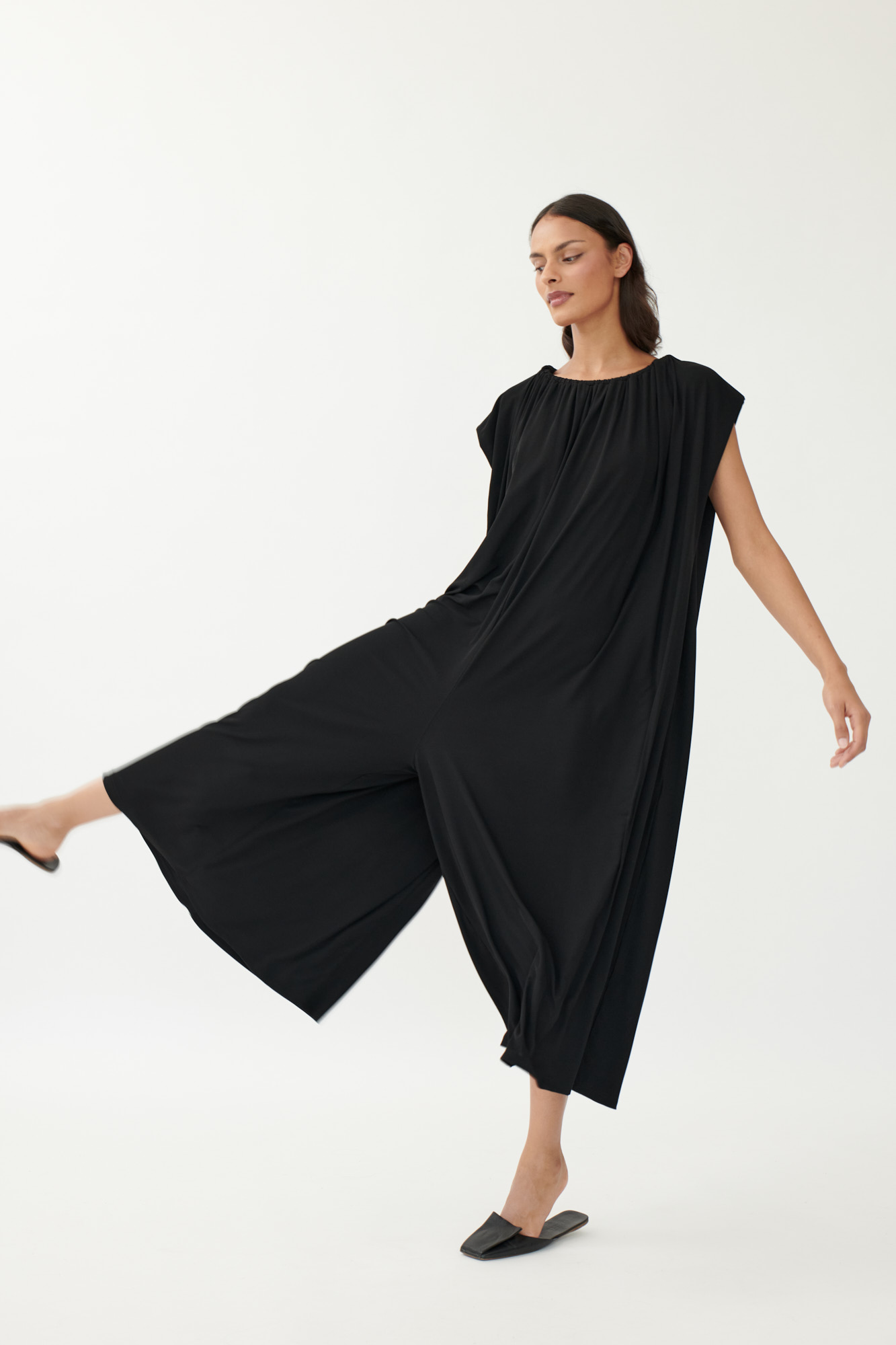 . Этот свободный комбинезон выполнен из струящегося вискозного трикотажа. Мягко драпированный круглый вырез с разрезом и молнией обеспечивает удобство при надевании. Спущенные плечи и прямые, длинные штанины подчеркивают свободный силуэт. Несложная вещь для создания разнообразных образов.